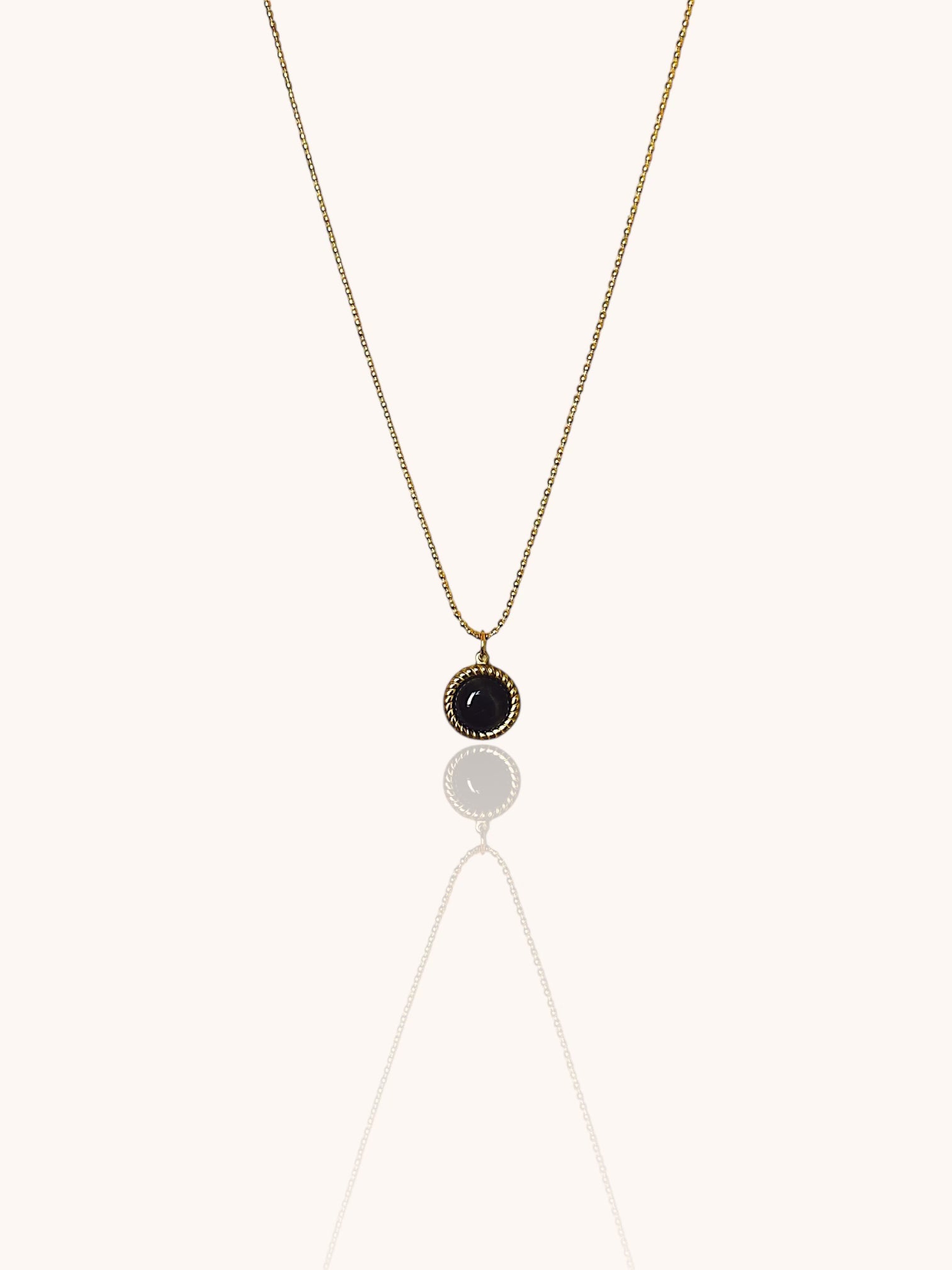 Description: This necklace showcases a striking black stone pendant set in a gold-plated stainless steel frame. Its timeless design adds sophistication and versatility. making it ideal for any outfit. Material: Gold-Plated Stainless Steel